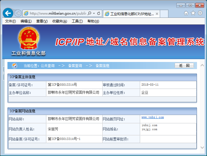 我公司更名為邯鄲市永年區(qū)明芳緊固件有限公司,同時公司網(wǎng)站在工信部的備案信息也進(jìn)行了更新并通過審核,備案號不變(冀ICP備05013314號-1)。這次更新備案信息,除了保留原有域名ynbzj.com(永年標(biāo)準(zhǔn)件之意)外,新增域名ynjgj.com(永年緊固件之意)。